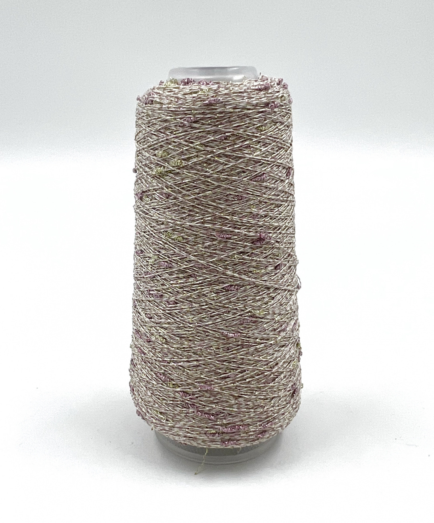 Номер 45 - белая ниточка, переплетенная двухцветным люрексом (розоватый и желто-зеленый). Шишечки расположены не часто, преимущественно розоватые, поэтому в сочетании с другой нитью будут смотреться очень нежно и деликатно.